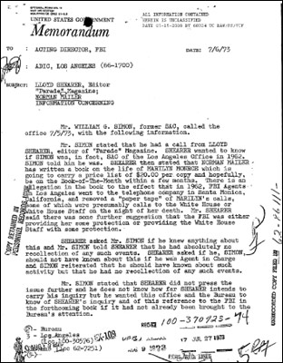 這些絕密文件記載,1973年夏天,美國猶太裔著名作家諾曼·梅勒剛剛出版了一本新書,其中披露FBI竊聽的電話記錄顯示,1962年夢露死前曾給白宮打過電話。這本書還暗示著,夢露的死因與FBI有種種聯系。一名專欄作家隨后撥通了FBI洛杉磯辦公室的電話,要求證實梅勒的質疑,此事讓聯邦調查局異常惱火。