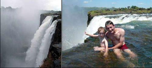 維多利亞瀑布類似這樣的天然泳池至少有兩個,魔鬼游泳池是其中之一,游客一旦來到這兒,就能盡情享受居高臨下、險象環生的快感。來自西雅圖的軟件工程師斯圖格仁偕妻子安杰拉來這兒歡度結婚1周年。