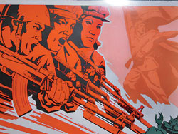 二00七年夏天,朝鮮當代畫家作品和國家畫室制作的宣傳海報在倫敦La Galleria首展時,現場掛滿了朝鮮紅色的旗幟,英倫天空從來沒有那么朝鮮。