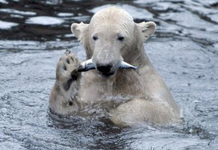北極熊“克努特”12月1日在柏林動(dòng)物園吃魚。