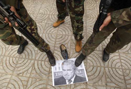 在巴勒斯坦的示威者也腳踩布什頭像