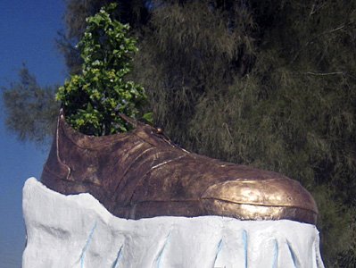 據香港東方日報即時新聞消息,巨鞋雕像豎立在被處決前伊拉克獨裁者薩達姆的家鄉提克里特,雕像種植了1株3米高的大樹,并坐落在1個白色的底座。