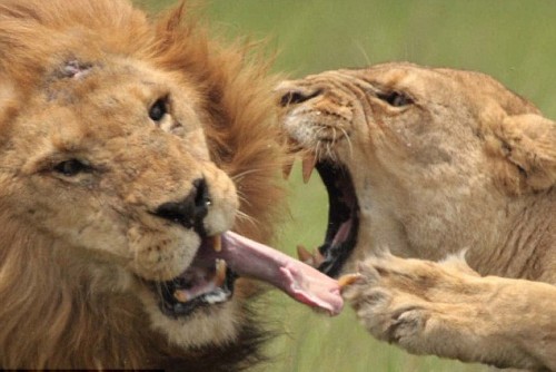中新網5月6日電 當你面對的是一只醋意大發,且處在狂怒狀態的母獅時,估計上帝來了也救不了你。博茨瓦納的一只公獅卻不幸遇到了這樣的事,據英國《每日郵報》報道,這只公獅由于未能經受住鄰居母獅的誘惑,有“出軌”的念頭,最后慘遭自己的雌性伴侶修理了,舌頭也被扯傷。