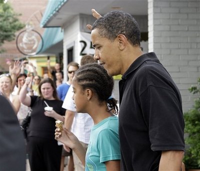 據(jù)臺灣中廣新聞網(wǎng)報道,這個星期天是美國的父親節(jié),奧巴馬在父親節(jié)前夕,忙里偷閑,在悶熱的午后,帶著兩個女兒去吃冰,他似乎短暫拋開了對食物熱量的警覺,大吃澆了糖霜以及杏仁的冰淇淋,第一千金也各自點了不同的冰品,父女三人在餐廳大約停留了15分鐘,奧巴馬還和店內(nèi)顧客握手拍照,臨走又買了一些狗點心,要帶回去犒賞第一家庭的寵物狗。