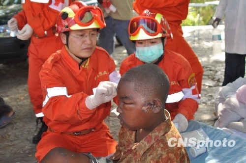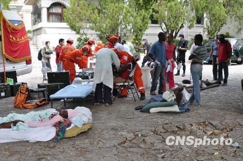 海地當地時間14日9時,中國武警總醫院赴海地國際救援醫療分隊開設第一個流動醫療點,已為110名受傷的災民提供醫療救助。海地總理禮賓官趕到醫療救助點,他握著來自中國武警總醫院的醫生的手說:“感謝中國國際救援隊,你們是第一支來總理府進行人道主義救助的救援隊”。