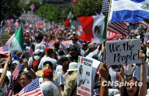 洛杉磯市墨西哥裔市長維拉萊戈薩現(xiàn)身游行現(xiàn)場,他以祖父從墨西哥移民美國的故事告訴大家追求美國夢是每位移民的權(quán)利,他旗幟鮮明地反對亞利桑那州的新移民法,并呼吁聯(lián)邦政府加快移民改革步伐。美國國會華裔眾議員趙美心向數(shù)萬民眾發(fā)表演說,“我們現(xiàn)在就要全面的移民改革!”趙美心等國會議員最近發(fā)起推動的一項移民議案得到了絕大多數(shù)拉丁裔移民家庭的擁護。