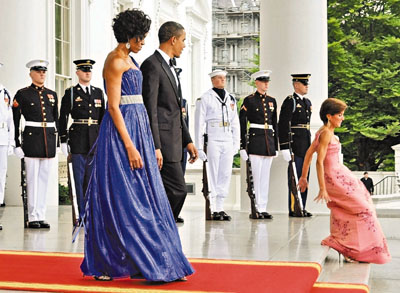 中新網5月21日電 據香港《文匯報》報道,美國總統奧巴馬19日在白宮設宴款待來訪的墨西哥總統時發生一段小插曲,白宮的禮儀官準備迎接貴賓時,忽然跌一跤,整個人坐在階梯上,受驚的她立刻站起來,開玩笑警告攝影記者不要拍照。