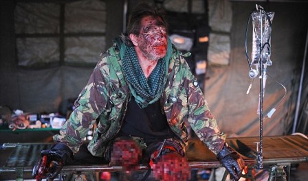 借助涂抹假血等化妝技術,斯威夫特看上去就像是一名剛剛在爆炸中嚴重受傷的士兵。他雙腿齊刷刷地斷掉,斷腿裹著的繃帶滲出血跡,周圍還掛著被炸爛的肉、皮,有的地方骨頭還露了出來。