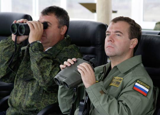 據英國《每日電訊報》28日報道,近日,俄羅斯正同白俄羅斯在加里寧格勒地區展開聯合軍事演習。俄羅斯總統梅德韋杰夫也身著軍裝出現在演習現場,他甚至端起一把機槍,并且用雙筒望遠鏡觀看演習情況,展現自己的硬漢形象。