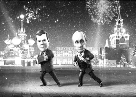 元旦夜晚,俄羅斯國(guó)家電視臺(tái)第一頻道突然出現(xiàn)了總統(tǒng)梅德韋杰夫和總理普京的形象,只是這次他們變成了3D卡通玩偶。在時(shí)長(zhǎng)兩分半鐘的短片中,左邊的梅德韋杰夫拉著手風(fēng)琴,右邊的普京手搖鈴鼓,兩人在紅場(chǎng)上邊唱邊跳,共同評(píng)說(shuō)2009年,不但諷刺了烏克蘭天然氣事件,還把梅、普共治體制幽默了一把。