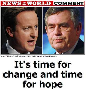 該報(bào)說,經(jīng)過深思熟慮,《世界新聞報(bào)》相信卡梅倫和他的保守黨應(yīng)當(dāng)被給予執(zhí)政的機(jī)會(huì),“眼前,他們(保守黨)寄托著我們對(duì)光明、合理、安全和更有榮譽(yù)的未來!