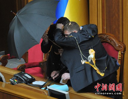 27日,烏克蘭最高拉達召開會議,討論是否通過俄黑海艦隊駐烏克蘭克里米亞半島的租期延期協議,但會議現場一度發生騷亂。議長利特溫被反對派議員用雞蛋打,不得不撐開黑傘躲在后面。現場還發生了肢體沖突,人們扭打在一起,一片混亂。更有人趁亂在議會廳內放置至少二顆煙霧彈,導致大廳被一片濃煙籠罩,大家紛紛捂住口鼻。