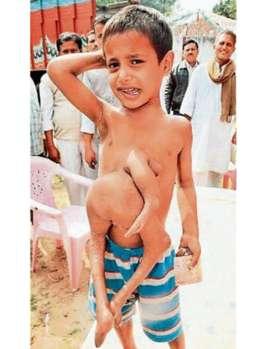 據德國《圖片報》2月19日報道,現年8歲的迪帕克·庫馬爾是一名來自印度比哈爾邦的小男孩。從一出生,他的外貌就把周圍的人驚得目瞪口呆:他長著4條腿和3支手臂,在他腹中有個孿生弟弟和他一起來到這個世界上。