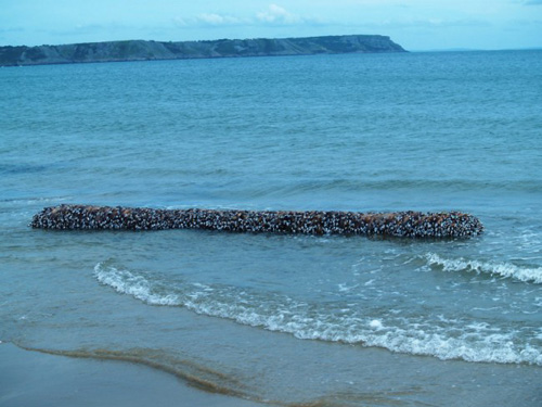 度假游客麗貝卡・波特以為自己看見了“一只活生生的大海怪”。她說:“它有兩米長,像電線桿子那么粗”,“事實上它們可能是我見過的最大型的飄浮的狗爪螺(又稱茗荷兒,鵝頸形藤壺)標本”。經專家驗證后,這個所謂的異星怪物原來是不計其數的狗爪螺。它們原本生活在海洋深處,受壞天氣影響從海里翻涌出來,并密密麻麻地附著在一塊木頭上隨波逐流,最終到達海灘,才成了這副模樣。