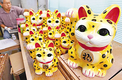 因日語中“豹”和“票”發音相同,原本“招財貓”的身體被圖上了豹子花紋。“招票貓”每只都由手工涂上黃色和黑色的顏料。據說制作這樣的一只至少需要4天,而上色一天只能完成20只。