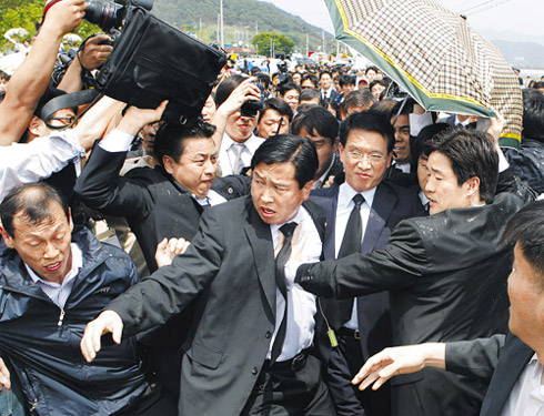 此外,鄭東泳議員夫婦也只能打道回府。“盧愛會”會員和村民們對走向村子入口的鄭議員大喊“叛徒”,并阻止他們吊唁。被攔住去路的鄭議員也只能返回。