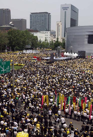 在景福宮遺體告別儀式結(jié)束后于中午12時30分出發(fā)的盧武鉉的靈車,經(jīng)由東十字閣、世宗路和太平路,于下午1時20分抵達(dá)首爾廣場。