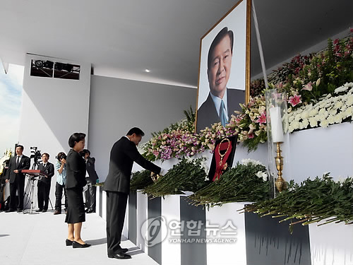 李明博當天與夫人金潤玉女士和青瓦臺政務首席秘書孟亨奎、發言人李東官一同進行了吊唁。