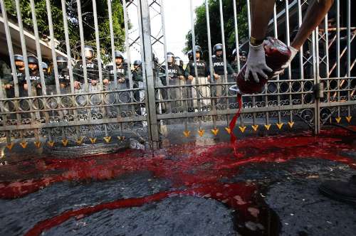 防暴警察讓部分紅衫軍代表提著數(shù)桶鮮血進(jìn)入鐵閘。他們?cè)诒娙说臍g呼聲中,穿過(guò)鐵甲威龍般的軍警隊(duì)列,行至總理府正面的鐵門(mén)前。在媒體的鏡頭前,紅衫軍代表們將鮮血傾倒在那里。