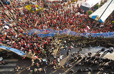 榴彈襲擊翌日,數百名防暴警察手持盾牌警棍,沒有攜帶槍械,向購物區的紅衫軍集結點推進。紅衫軍用尖竹和車胎堆成3米高的路障,并灑上汽油,迫使警方退后。紅衫軍后來答應警方要求,后退100米,但并未拆除路障。
