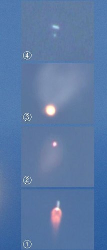 韓國最大的國營電視臺KBS拍到的畫面顯示:①圖升至距地面70公里高空的“羅老”號的火焰開始是紅色的,②圖接著火焰變大,呈現類似爆炸后的景象,③火焰越變越大,并向下掉落。④火焰消失后,被推測認為是“羅老”號的白色物體開始向下墜落。