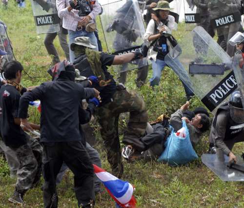 由于當地居民不滿黃衫軍在當地示威,村民擔心會影響國家聲譽和柬埔寨的關系,因此村民在通往柏威夏寺的路上搭起路障,防暴警察也全副武裝,防止示威者通過。電視片段所見,黃衫軍多次揮動長棒,與防暴警察和試圖阻止他們進入柏威夏寺一帶的村民發生沖突(見圖)。省政府官員表示有數十人在騷亂中受傷,其中二十人要送院治理,一名送院者頸部受到槍擊。事件最后在警方調解下解決。