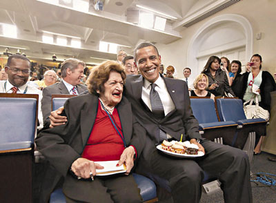 8月4日是奧巴馬48歲生日,也是赫斯特報(bào)系專(zhuān)欄作家湯馬斯的89歲生日。白宮首席發(fā)言人吉布斯在白宮新聞發(fā)布室內(nèi)進(jìn)行每日簡(jiǎn)報(bào),大批記者聚集向他提問(wèn),此時(shí),奧巴馬捧杯形蛋糕入內(nèi),帶領(lǐng)記者團(tuán)為湯馬斯唱生日歌。