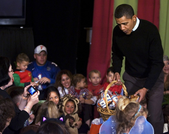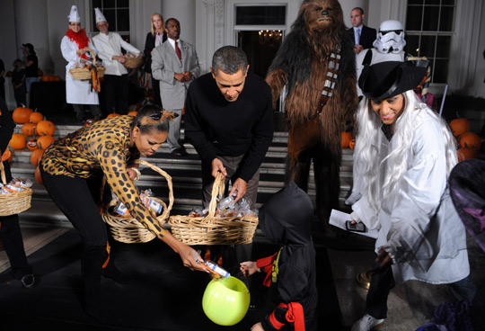 雖然奧巴馬與夫人米歇爾沒有特殊打扮,但親自向小客人分發(fā)糖果。兩人稍后還與副總統(tǒng)拜登夫婦接見軍人及白宮職員家眷,共度萬圣節(jié)。
