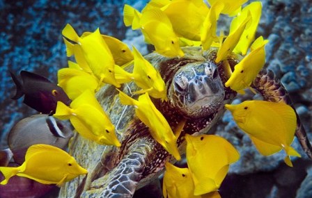 據(jù)報(bào)道,攝影師麥克.羅伯茨(Mike Roberts)在夏威夷普阿科(Puako)潛水時(shí),發(fā)現(xiàn)一只海龜安靜地停留在水中,等待一群顏色鮮艷的魚在其身邊忙碌地“工作”,為它啄去身上的寄生物,替它“洗澡”。
