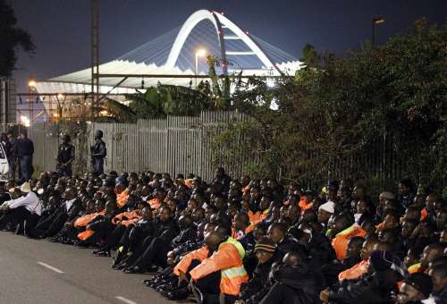 約150名的保安人員從摩西馬比哈達(dá)球場附近出發(fā),一路載歌載舞行進(jìn)到繁華的市中心。隨著不斷人數(shù)的不斷加多,示威者又有秩序地返回到球場,守候在那里的數(shù)十名警察將他們控制在一片隔離區(qū)域。