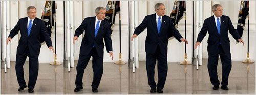 中新網3月7日電 美國共和黨總統參選人麥凱恩5日鐵定取得黨內提名,氣勢逼人,約了總統布什吃午餐,作為布什正式宣布支持他的前奏,但竟然大牌到要布什在白宮門前久等。布什為打發時間,竟在一眾記者面前跳起踢跶舞(見圖),滿堂發笑。