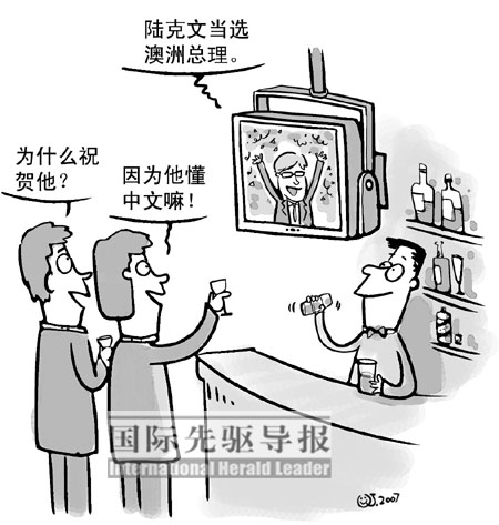 11月24日,澳大利亞聯邦大選,工黨勝出,50歲的陸克文成為澳大利亞新總理。有人說,陸克文是澳大利亞的布萊爾。這兩位政治明星都充滿活力、富有親和力、相貌俊朗,而且同為工黨領袖,除了陸克文能講一口流利的漢語之外,其他相似之極。