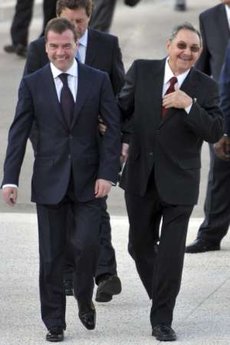 梅德韋杰夫訪問哈瓦那之前,先在委內瑞拉與美國宿敵查韋斯總統會晤,磋商提供更多軍售。古巴是梅德韋杰夫這次拉美之行的第四站。此前,他先后訪問了秘魯、巴西和委內瑞拉。