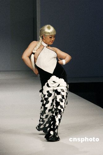 2007年11月4日,中國國際時裝周舉行半狄熊貓時裝發布會。芙蓉姐姐以模特身份展示了半狄熊貓時裝“網絡紅人”造型,首次在中國國際時裝周亮相的芙蓉姐姐在T臺上大秀“S”造型,由于時裝上身過小,芙蓉姐姐在盡情舞蹈中胸部大泄春光。中新社發 魯谷 攝