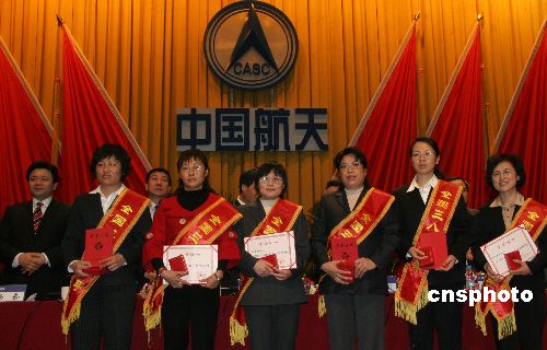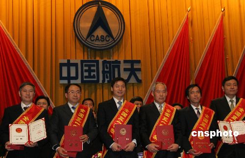 中華全國總工會決定頒發(fā)該集團(tuán)一批為首次月球探測工程做出貢獻(xiàn)的集體和個人“全國五一勞動獎狀”、“全國五一勞動獎?wù)隆保袊\載火箭技術(shù)研究院“長征三號甲”系列運載火箭總指揮岑拯(左三)等獲得“全國五一勞動獎?wù)隆薄?/div>