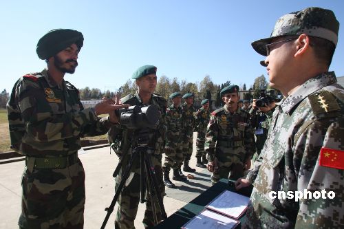 圖為印軍向參加訓練的中國士兵講解夜視儀的性能。