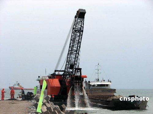 12月24日上午10時(shí),“南海一號(hào)”靠近碼頭,直至當(dāng)日下午4時(shí)沒(méi)有前進(jìn),登陸時(shí)間不能確定,挖沙船正在岸邊清理航道。中新社發(fā) 索有為 攝