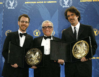 科恩兄弟從上屆最佳導演斯科塞斯(中)手中接過“獎盤”。