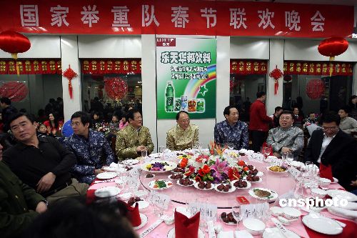 國(guó)家體育總局局長(zhǎng)劉鵬(中),舉摔柔中心主任馬文廣和國(guó)家舉重隊(duì)隊(duì)員一起歡度除夕之夜。
