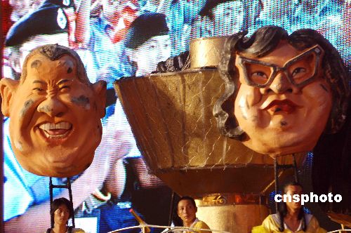 2007年,香港明星曾志偉、沈殿霞的大頭像出現(xiàn)在深圳世界之窗舉行的“花開正十年”大型聯(lián)歡晚會(huì)巡游行列中。中新社發(fā) 陳文 攝