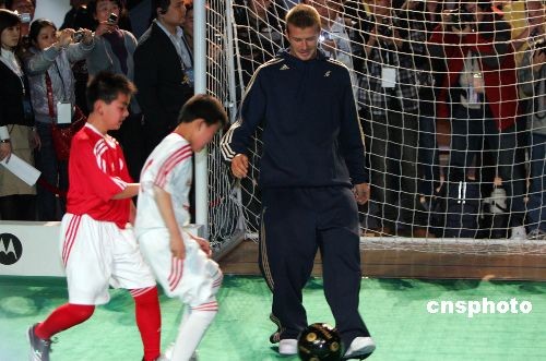 3月3日,足壇巨星貝克漢姆在上海出席中國球迷見面會,并與在滬進城務工子弟“交流球技”。中新社發 湯彥俊 攝