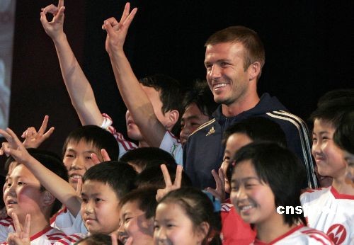 圖為貝克漢姆與小朋友在一起合影。