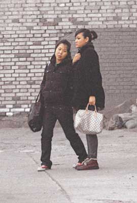 田亮太太葉一茜(右)由影樓步出,穿著大褸的她仍遮掩不住懷孕已7個月的大肚。