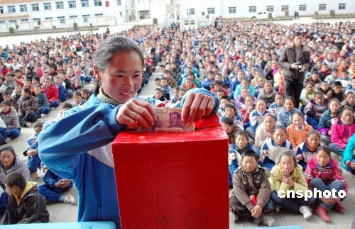 拉薩市堆龍德慶縣中學的1825名師生3月23日向“3·14”事件受害民眾捐款,同學們拿出平時節省的零花錢踴躍獻愛心。3月14日拉薩市發生打、砸、搶、燒事件后,拉薩市各企事業單位、民間組織等社會各界紛紛譴責達賴集團的罪惡行徑,紛紛捐款捐物關懷受害無辜民眾。中新社發 周波 攝