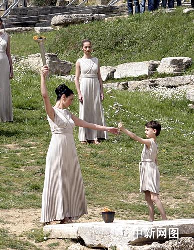 希臘當地時間3月24日,北京二00八年奧運會圣火采集儀式在古奧林匹亞競技場舉行,最高女祭司接過男孩敬獻的橄欖枝。中新社記者 王歡