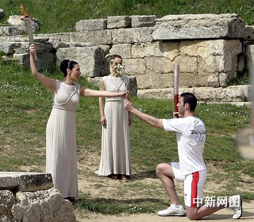 希臘當地時間3月24日,北京二00八年奧運會圣火采集儀式在古奧林匹亞競技場舉行,最高女祭司將橄欖枝傳遞給第一火炬手希臘運動員亞歷山大,并用古希臘語對他說:“將圣火傳遞給世界,告訴人們奧運會就要開始了。 中新社記者 王歡