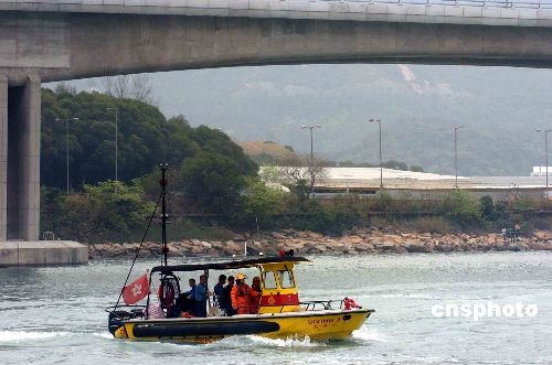 三月二十五日,香港海事處及消防處繼續在大嶼山對出海面,搜救十八名被困沉船的烏克蘭船員。圖為參與搜救的船只在出事海域展開工作。中新社發 譚達明 攝