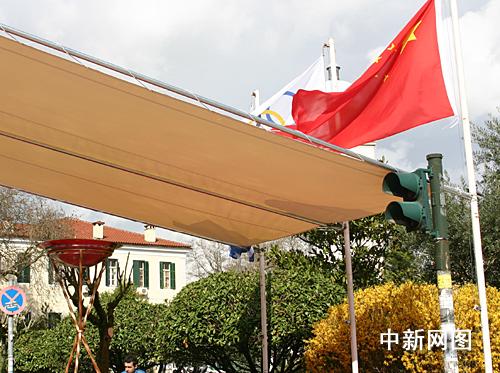 3月25日,北京2008年奧運圣火希臘傳遞第二天,慶典儀式在終點約阿尼納舉行。存放北京奧運圣火的圣火盆架在國旗下。中新社記者 王歡