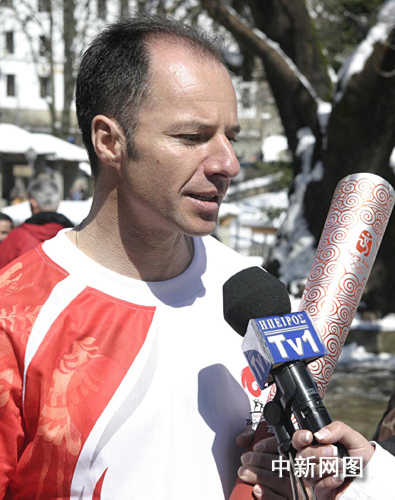 3月26日,北京奧運會圣火希臘境內(nèi)傳遞第三日,抵達冰雪覆蓋的山城邁措翁。火炬手、希臘越野滑雪運動員尼克考斯期待自己能參加2010年溫哥華冬奧會。中新社記者 王歡