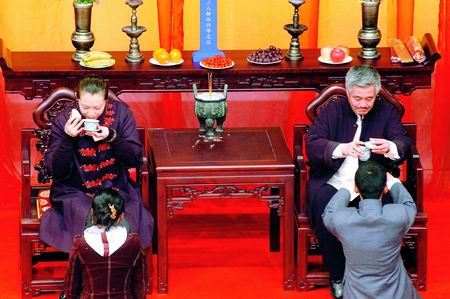 我覺(jué)得一個(gè)團(tuán)隊(duì)要有點(diǎn)規(guī)矩,師徒之間要有一種傳統(tǒng)。我是一個(gè)民間藝人,我經(jīng)營(yíng)二人轉(zhuǎn)從沒(méi)有到有,從不景氣到想看買(mǎi)不到票,這個(gè)過(guò)程給我?guī)?lái)很大的收獲。那些學(xué)生,之前我都已經(jīng)一批一批收完了,我想在那天給他們一個(gè)證書(shū)、給他們一個(gè)忠告,讓他們知道趙門(mén)的規(guī)矩,怎么做人。那天收了35個(gè),只有四五個(gè)是新收的學(xué)生,只是有一個(gè)排序,我給他們發(fā)了一個(gè)聘書(shū),發(fā)了一個(gè)我給他們寫(xiě)的字畫(huà)。